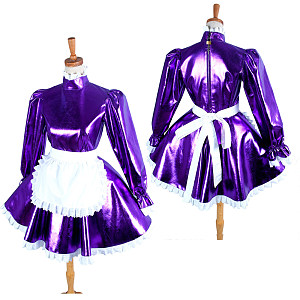 This purple heavy PVC Lockable sissy maid dress delivers a bold, glossy look for crossdressing, cosplay, and fetish play. Made from thick, durable PVC with a reflective shine, it’s paired with a white lace-trimmed apron for a striking contrast. The long puff sleeves and high-neck design add an elegant yet dominant presence.