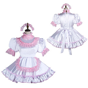 - Product Name: Fondcosplay White Satin Lockable Sissy Maid Dress with Pink Lace, Apron and Headpiece – Crossdressing Outfit [G3746]